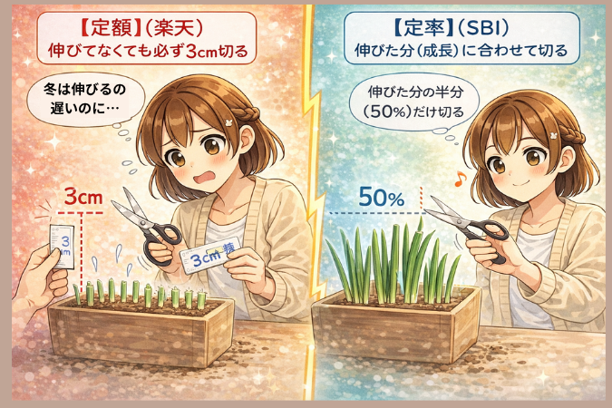 でも、SBIのように「今の分量の〇%」と決めておけば、成長が遅いときは収穫も少なめに、自動で調整してくれます。 もらえる現金は毎月変わるけれど、ネギの「根っこ(元本)」をしっかり守れるから、ずっと収穫が続けられるんです。