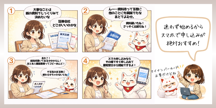 SBIと楽天、どちらを選んでも正解です。一番の失敗は、迷って始めないこと。まずはどちらか選んで、やると思ったタイミングで申し込みを済ませてしまいましょう!